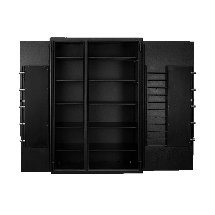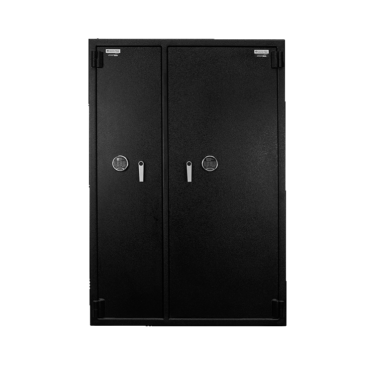 Inventory safes are used by companies that need to store large amounts of valuable items. This model is our largest version, and has two separate chambers that are independently controlled by their own lock. Each side has 5 reinforced steel shelves.