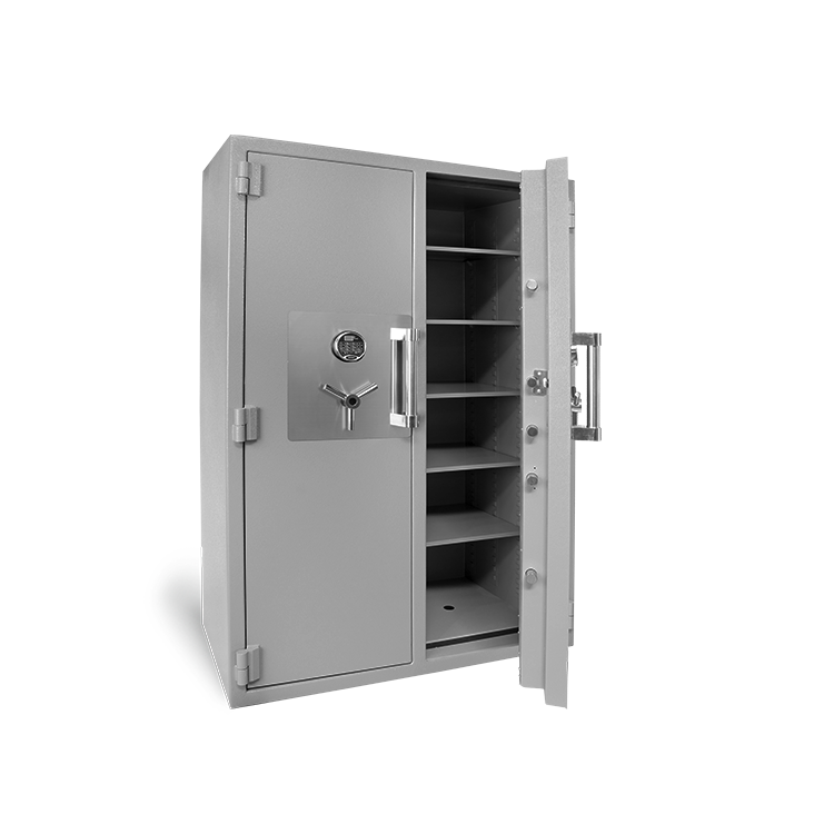 The body and door of our TL-30 safes are constructed of hardened steel, high-pressure concrete, and other proprietary hard-to-drill products. The body is 3″ thick and the door is 5-1/4″ thick. Each door on this safe are protected by ten 1-1/4″ thick bolts (5 active).